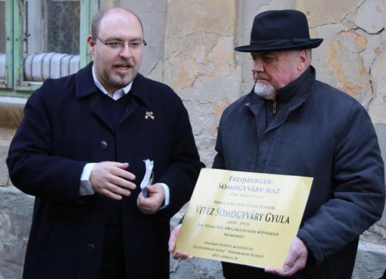 Ma hoztunk ide egy kis szimbolikus emlékjelet. Egy kis fém emléktáblácskát készítettünk (hasonlót mint tavaly a tókerti fiókkönyvtárra is), amelyet jelképesen most leleplezünk Somogyváry emlékére. Tudjuk, hogy a szigorú műemlékvédelmi szabályok nem teszik most lehetővé, hogy felhelyezzük, ezért megőrzésre átadjuk majd az itt lakóknak. Jövőre lesz 65. évfordulója Somogyváry elhunytának. De jó lenne, ha egy esztendő múlva már pozitív dolgokról számolhatnánk be itt állva. Valahogy csak meglehetne menteni ezt az értékes pápai házacskát, amelyet valóban meg tudnánk jelölni egy emléktáblával néhai Freißberger-Somogyváry polgártársaink emlékére, - az utókor számára.